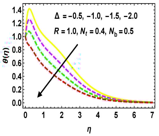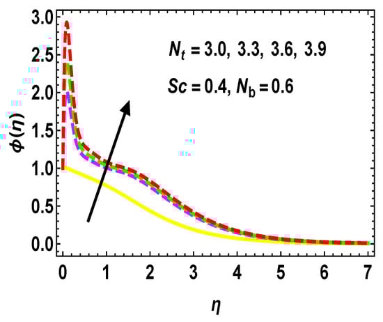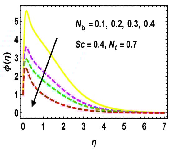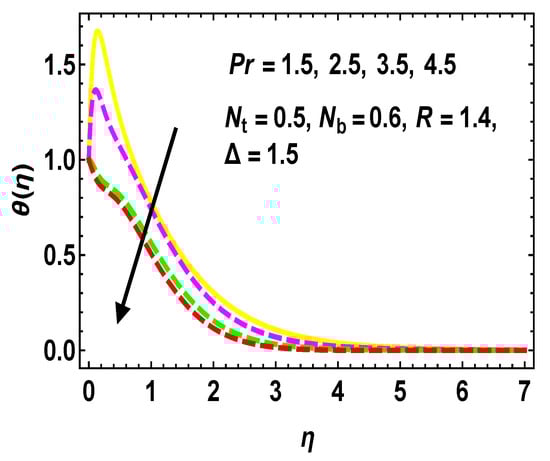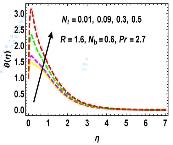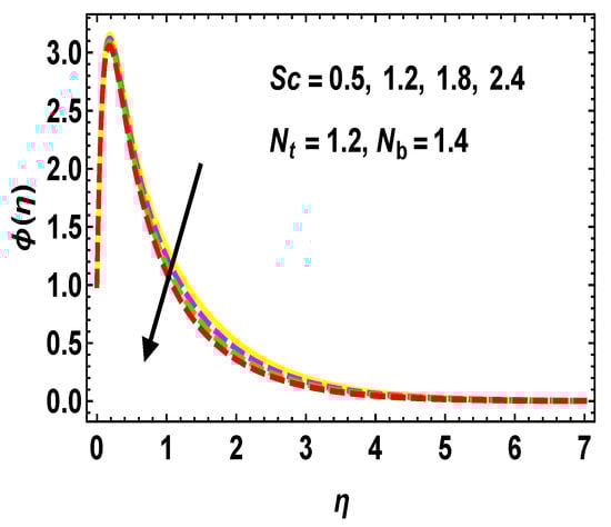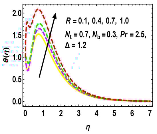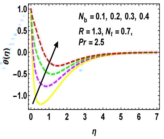 The important characteristics of the thermal and concentration properties are graphically displayed in this subsection for certain embedded parameters, such as the Brownian motion parameter, the thermophoresis parameter, the radiation parameter, the heat generation/absorption parameter, the Prandtl number, and the Schmidt number. Figure 9, Figure 10, Figure 11, Figure 12, Figure 13, Figure 14, Figure 15, Figure 16 and Figure 17 show the impact of and , which are, respectively, plotted for certain values of , , , R, , and . The behavior of the heat source or the heat sink parameter on has been analyzed in Figure 9 and Figure 10. From these figures, it is recognized that the heat source enhanced the heat transfer variation. This enhancement in the temperature of the fluid causes the greatly-induced flow toward the plates through the buoyancy impact. Moreover, the figures show that the heat sink parameter declines . This decline in causes a reduction in the boundary layer flow, which is the result of the buoyancy impact on the thermal problem. Figure 11 and Figure 12 elaborate on the effects of on when = 0.7, = 2.5, R = 1.3 and when = 0.7 and = 0.4. These results recognize that is enhanced for bigger values of , whereas the reverse trend is noted for . Figure 13 and Figure 14 indicate the effects of on whenever = 0.6, = 2.7, R = 1.6, and whenever = 0.6 and = 0.4. Due to the enhancement in the thermophoretic parameter, the thermophoresis force is enhanced, which helps the fluid to migrate from the heated location to the cooler one. Thus, clearly, and are enhanced for higher rates of . Figure 15 indicates the behavior of R on . It is necessary to keep in mind that more of an estimation of R strengthens because the radiation factor produces thermal energy in the flow regions. Therefore, increments have been observed in . The behavior of on is exhibited in Figure 16. From this graph, we conclude that an increase in declines the curves. The physical interpretations of the Prandtl number follow its definition as a ratio of the momentum diffusivity to the thermal diffusivity. It is common in the problem of heat transfer that is utilized to reduce the relative thickness of the momentum and the thermal boundary layers. Figure 17 indicates that there is a reduction in for = 0.5, 1.2, 1.8, and 2.4 when = 1.2 and = 1.4. Physically, the Schmidt number provides the measurement of the relative effectiveness of the mass and momentum transport by diffusion in the concentration and the velocity boundary layer.