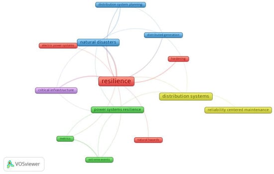 The increase in power outages associated with adverse weather events in the United States has had significant economic ramifications. Climate change has exacerbated the occurrence of extreme weather events such as hurricanes, heat waves, wildfires, and snowstorms. This, combined with increased power demands, is now regularly causing billions of dollars’ worth of damage due to resultant power grid disruption. Between 2003 and 2012, 679 power outages were caused, which affected at least 50,000 customers, and up to 90% of these failures are attributed to disruptions in the distribution systems [1]. Some of the more prominent occurrences in recent memory include Hurricane Sandy in 2012, which left 8.5 million people without power [1]; the 2021 Texas winter storm, which affected a million residents [2,3]; and the 2017 Hurricane Irma in Puerto Rico, which affected power distribution to 6.7 million customers [4]. The economic costs associated with these disasters run into the hundreds of billions and, at the same time, lead to significant societal damage. For instance, the Texas winter storm resulted in multiple deaths because electric heaters and medical equipment could not run without power, leaving vulnerable people exposed to extreme cold and/or without critical life support [2,3]. One reason why power systems are particularly vulnerable to extreme weather events is that they are mainly designed and optimized for normal weather conditions and are not equipped to handle less common extreme weather events. While this is economically viable in the short term, it exposes the power grid to catastrophic failures that are costlier in the long run. Another essential dynamic to consider is that disasters that lead to shocks and stresses are often connected, making the risk two-fold. As such, the risk is multidimensional and self-perpetuating. For example, higher temperatures due to climate change result in higher power demands, therefore increasing the load on the power system. At the same time, there is a higher risk of adverse weather events, which means that when disaster strikes, it finds an already compromised power grid that is easier to knock down. It is, therefore, paramount that utility companies strengthen their systems’ readiness for extreme events. During the past decade, there has been much focus in the literature on the resilience of the electric power grid against large-scale disturbances, mainly natural disasters. Figure 1 illustrates a keyword co-occurrence map of the recent publications on power grid resilience.