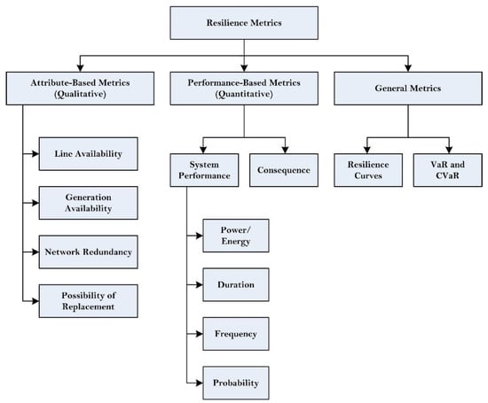 Resilience metrics, also known as resilience indices or indicators, are a means for evaluating the level with which a power system can withstand a HILP event. The concept of resilience is complex and dynamic. Traditional reliability metrics such as the System Average Interruption Frequency Index (SAIFI), System Average Interruption Duration Index (SAIDI), Customer Average Interruption Duration Index (CAIDI), and other related indicators cannot be used here due to their inability to model catastrophic HILP events. In general, resilience metrics can be categorized into three groups: attribute-based, performance-based, and general. A breakdown of these groups can be seen in Figure 3.
