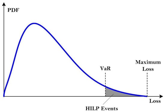 As mentioned before, performance-based metrics can be defined using probability distributions, for instance, the expected value of lost energy during an event. This method can be used when the system’s resilience is evaluated over a long period of time or for many potential scenarios. However, the probability distribution functions characterizing power outages during HILP events are heavy-tailed [37]. This may negatively impact the effectiveness of metrics based on expected values, medians, or standard deviations, in that such values might underestimate the risk of the extreme event. To address this, other risk-based metrics are defined in the literature [37], namely Value at Risk (VaR), which indicates the upper quantile of potential losses and informs about the percentage of losses that are greater than this threshold, and Conditional Value at Risk (CVaR), which measures the expected value of losses that fall above the VaR (see Figure 6).