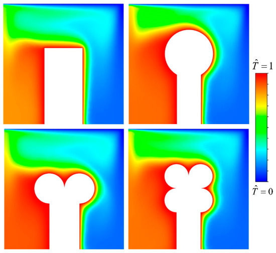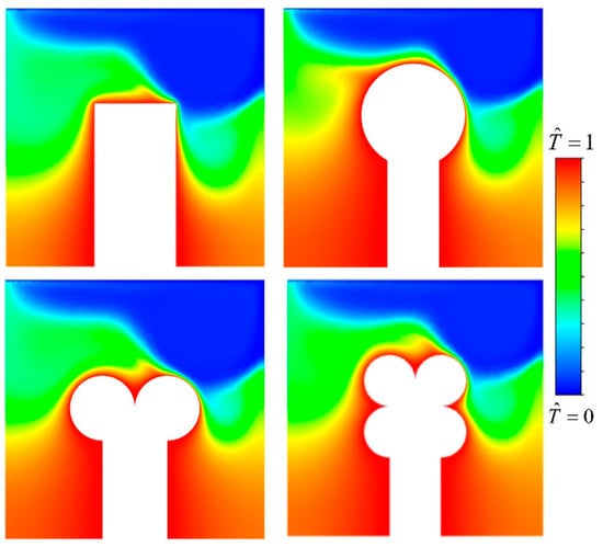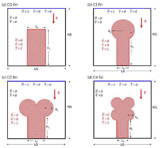 Convective heat transfer is one of the most studied research areas in mechanical engineering due to its wide range of practical applications both in industry and consumer electronics, from race car radiators to solar panels to mobile devices—virtually any technology dealing with heat needs some way to disperse it and so there is great interest in maximizing the efficiency of the heat transfer in these systems. Various scenarios have been investigated previously, from the simple square cavity with a rectangular fin [1,2,3,4,5,6,7,8], to more geometrically complex cases [9,10,11,12,13,14,15,16] to investigations into the effects of less common conductive mediums such as nanofluids [6,7,17,18] and non-Newtonian fluids [19]. As this area is so widely studied, there is a great breadth of variety in the literature: studies like Starner et al. [1] investigated free-convection from rectangular-fin arrays, Mahmud et al. [2,11] studied wavy cavities and the orientations of a square cylinder, Ting et al. [7] highlighted the impact of surface roughness in a square cavity, Aziz [20] investigated the effects of different fin shapes, Szodrai [21] investigated heat sink shape for a hypothetical scenario, where air cooling is needed and to save energy the pressure loss and the cooling performance have to be equally optimized, while some like Tari and Mehrtash [22] focused on how heat transfer can be affected by various boundary configurations with respect to gravity, and others explored the consequences of using a porous fin [23].