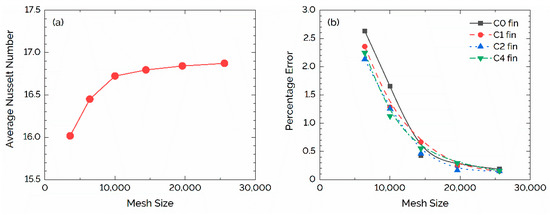 (a) The results of the mesh test for the C1 fin with Ra = 105 and Re = 103. Here, the number of mesh elements is plotted against the average Nusselt number for each size showing the convergence to the true answer as the mesh becomes finer. (b) The percentage error in each mesh size for each fin geometry (as shown in Figure 2).