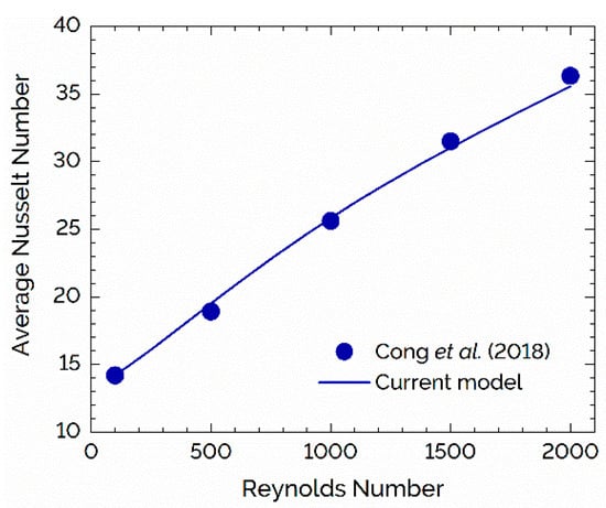 The governing partial differential equations were solved numerically using the built-in SIMPLE pressure-based solver of ANSYS Fluent, with the second-order upwind scheme used to spatially discretize the equations. The solution was considered converged when the residuals were smaller than 10−6 for the mass and momentum equations and smaller than 10−8 for the energy equation. After a solution was calculated, the average Nusselt number (Nuavg) was found using the following expression [6,7]: