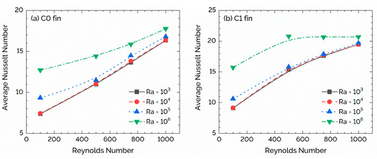 After running simulations for each fin with varying Reynolds and Rayleigh numbers, the results were collated so the effects could be compared. Figure 6a shows the variation in the average Nusselt number for the rectangular fin (C0 fin) as these parameters change, and it can be seen that increasing either the Reynolds or Rayleigh numbers results in an increased average Nusselt number, showing greater convective heat transfer under these conditions. The graph also clearly shows that for smaller values of Rayleigh number (≤104) there is little difference in average Nusselt number between orders of magnitude however as the Rayleigh number increases it begins to dominate the flow at Reynolds numbers below 500. This is indicative of the natural convection requiring a minimum threshold before it begins to meaningfully contribute to the heat dispersion. Moreover, as the Reynolds number increases it can be seen that the average Nusselt numbers calculated for each value of the Rayleigh number get closer together, illustrating how the flows become less and less buoyancy-driven, as the forced convection begins to dominate. It may also be noted that for lower Rayleigh numbers there appears to be a linear relationship between the Reynolds number and the average Nusselt number however this relationship becomes more quadratic as the Rayleigh number increases.