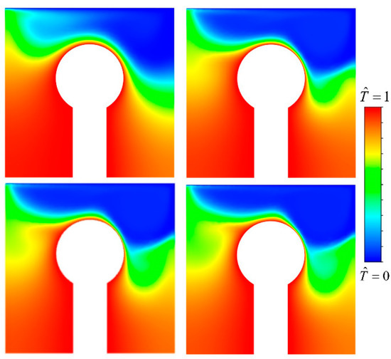 Contours of temperature at Re = 500, Ra = 105 for Al2O3-water nanofluid: (a) Cong et al. [6] and (b) result from the current model with the same configuration of Cong et al. [6].