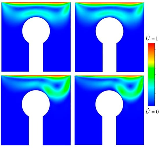 Velocity contours for the C2 fin with Re = 100 for varying Rayleigh numbers. From left to right, top to bottom: Ra = 103, Ra = 104, Ra = 105, and Ra = 106.