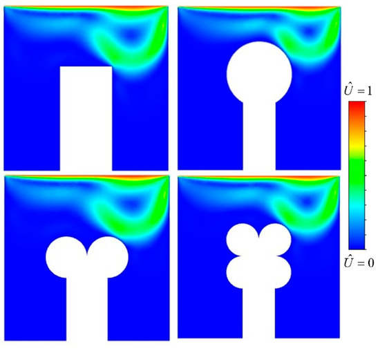 We considered a lid-driven square cavity with a fin from the center of the bottom. This geometry includes symmetrical boundary conditions on the left and right walls. The top surface of our cavity has a constant temperature and moves with constant velocity in the x-axis direction, providing both the temperature differential necessary to drive the natural convection and the external force required to drive the forced convection. The fin surface has a constant wall temperature . The dimensionless height and length of the cavity are both set to 1, and the fin area is set to 20% of the cavity area. All other surfaces are considered adiabatic, and the no-slip condition is applied. Figure 2 shows the specific geometries tested. For the C0 fin, the height-to-length ratio was chosen to be 2 which gave L1 = 1/√10 and H1 = 2/√10. For the alveolus fins, two cases were considered: (i) the radius of the alveolar sacs is equal to the width of the fin base (Figure 2b), and (ii) the radius of the alveolar sacs is half to the width of the fin base (Figure 2c,d). The side length (L2) and radius (R2) of the C1 fin was chosen to be 0.2, which led to H2 = 0.650. For the C2 fin, the radii were chosen to be 0.15, which constrained the length to 0.3 and resulted in a height of 0.380. Finally, the radii of the C4 fin’s circles were set to 0.1 giving a length of 0.2 and a height of 0.307.