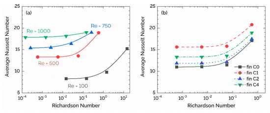 (a) Average Nusselt number against Richardson number for the C4 alveolar fin, and (b) average Nusselt number against Richardson number for each fin with Re = 500.