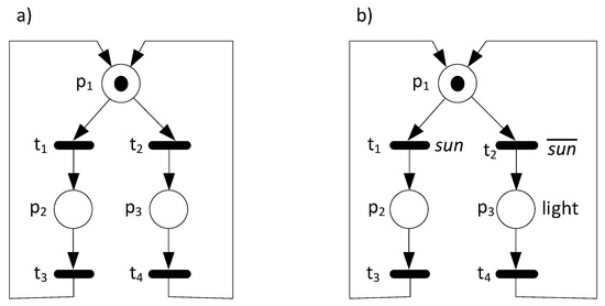 Consider an exemplary CPS shown in Figure 1. There are three places and four transitions in the net, while is initially marked. The model presented in the left (a) is specified by an ordinary (pure, classical) Petri net. In such a description, the behaviour of the system is not determined since both transitions and are enabled and can be fired. This situation is called conflict. One of the possibilities for conflict resolution is modification of the Petri net structure [52]. This obviously requires additional actions from the designers, which is time- and cost-consuming. Another possibility for conflict resolution is the application of interpreted Petri nets. The extension of the system is assumed from input and output signals, as presented in Figure 1b. The additional internal signal sun resolves conflict in the system: when it is active (binary equal to “1”), then transition is enabled and can be fired. Otherwise, in the situation where sun is not active (equal to “0”), transition is enabled. Note that the CPS shown in Figure 1b reflects the real-life situation. Depending on the daylight level, the light (associated with the place ) is turned on or off. The adequate decision is made based on the sensor (represented in the system by the signal sun).