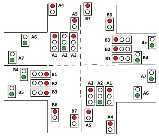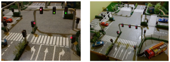 Finally, the bit-stream was generated. This file was used during the physical implementation of the system in the FPGA device. The hardware validation of the designed CPS was performed with the use of the miniaturization model of the crossroad traffic light system. Figure 7 shows such a miniaturization model of the traffic light controller during the validation process.