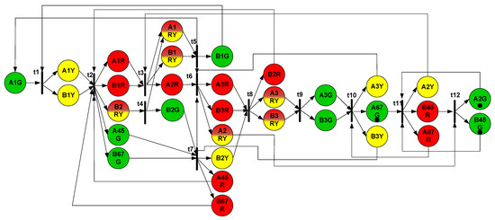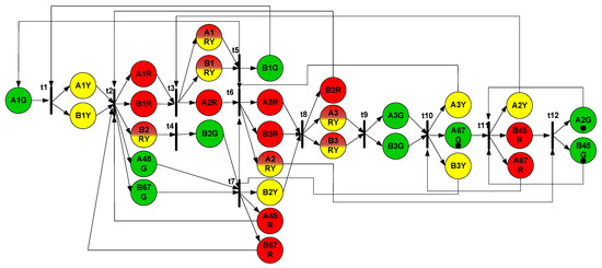 Finally, the output signals are associated with places by the continuous assignments. Note that several output signals are associated with the same place. For example, outputs B6R and B7R are assigned to p [32] (which refers to the place B67R denoted in Figure 4).