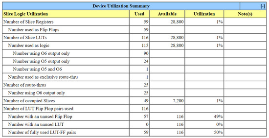 Logic synthesis and implementation resulted in no errors, nor were any warnings detected. The summary utilization of the FPGA device is shown in Figure 6. The implemented crossroad traffic light system consumed 116 look-up tables (LUTs) and 59 registers (Flip Flops). This resulted in 49 occupied Slices of the device. It should be underlined that this is just a fraction (1%) of the available resources.