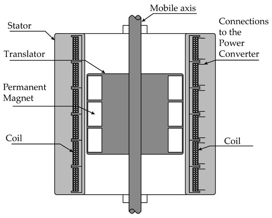 The diversity of the wave resources and the instability of energy intensity make the design of wave energy converter systems (WECs) very challenging [7,8]. To overcome these difficulties, selecting technologies for generating electrical energy from capturing mechanical energy is a crucial aspect of the design [9]. In this regard, the combination of point absorbers, which harvest the energy from the motion of submerged or floating buoys [10], and linear generators, which provide high energy density and direct conversion [11], have proved to be highly efficient because the mechanical swinging movement is directly transformed into electrical energy. Several examples of linear generators used with point absorbers have been reported, such as the Seacap (France), Islandberg Project (Sweden), PowerBouy (New Jersey), InfinityWEC (Sweden), PowerPod (UK), among others [12].