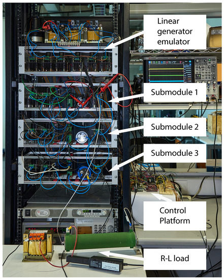 An experimental setup is built to verify the proposed control scheme. The setup is shown in Figure 6, where it is possible to identify the submodules of the cascaded converter. The experimental setup is composed of three submodules, each connected to the secondary of a transformer whose input signal emulates the induced electromotive force (EMF) obtained in [29]. The output of the submodules is connected in series to an inductance and a resistance which model the underwater transmission line. Although the proposed cascaded multilevel converter is intended to generate medium voltage by using ten cells of 500 V each, the experimental setup is limited to three cells due to the limited availability of converters to emulate the linear generator. The DC voltage of each cell is also reduced to 35 V for safety purposes.