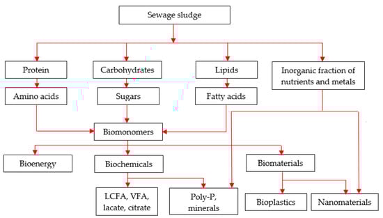 Recent years have brought significant evolution and changes in sewage treatment systems, both for domestic and industrial wastewater—a process driven by the ever-more stringent regulations regarding treated effluent quality and implementation of circular economies []. Other major drivers include global zero-waste policies, greenhouse gas (GHG) emission limits, as well as calls for reducing energy consumption and improving the share of renewables in the total energy mix []. Nowadays, wastewater is actually no longer treated as waste, nor are wastewater treatment plants (WWTPs) treated as systems designed primarily to degrade or neutralize pollutants for safe discharge into the environment. New WWTP installations and upgrades of existing ones are increasingly being designed in accordance with the integrated biorefinery approach, where energy and value-added substances/feedstocks are harvested from the wastewater and sludge [,]. Types of substances recoverable from wastewater are listed in Figure 1.
