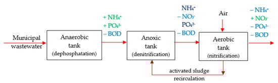 Despite the many reports supporting the practicability, competitive performance, and cost-effectiveness of energy/material recycling in WWTP systems, the vast majority of current plants still use the energy-intensive and waste-generating suspended growth (aerobic activated-sludge) process []. In this method, pollutants are removed by harnessing bacterial metabolism, activated by creating separate zones with different aerobic conditions []. Organic compounds are biodegraded over the entire WWTP process line in the aerobic zone, hypoxic zone, and anaerobic zone []. Nitrogen removal requires consecutive anaerobic ammonification steps, followed by nitrification in the aerobic chamber and denitrification, with nitrates converted to molecular nitrogen and released into the atmosphere []. Phosphorus is removed in two stages. Orthophosphates are first released into the wastewater under anaerobic conditions and then intensively accumulated by poly-P bacteria under aerobic conditions [,]. Phosphorus can also be removed via chemical precipitation with inorganic coagulants and polyelectrolytes []. A flowchart for a traditional suspended-activated-sludge WWTP is presented in Figure 2.