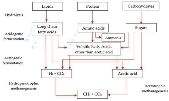Methanogenic fermentation pathways for anaerobic wastewater treatment (inspired by [,,]).