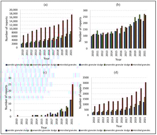 Number of articles found in (a) Google Scholar, (b) Scopus, (c) MDPI, and (d) Science Direct databases between 2010 and 2021 for the keywords “aerobic granular sludge”, “anaerobic granular sludge”, and “microbial granules”. Accessed 30 October 2022.