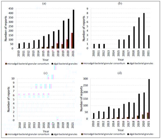 Number of articles found in (a) Google Scholar, (b) Scopus, (c) MDPI, and (d) Science Direct databases between 2010 and 2021 for the keywords “microalgal-bacterial granular consortium” and “algal-bacterial granules”. Accessed 30 October 2022.