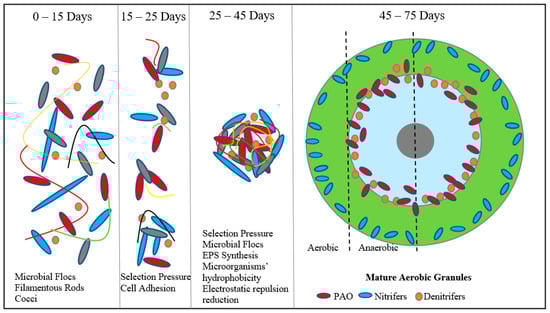 AGS and AnGS granules are formed when microbial cells self-immobilize in response to certain specific environmental conditions in the reactor []. This means that these biological structures can be grown not only in newly designed plants, but in most existing wastewater treatment systems. An undeniable advantage of this technology is that it can be used to obtain a granular microbial biomass by controlling the technological parameters of the process or applying slight modifications to the bioreactor design. The primary triggers of granulation within a bacterial community are a high volumetric exchange ratio and high flow rate (usually generated via internal recirculation), as the resultant hydrodynamic forces act upon the biomass []. The scheme of microbial granule formation in the example of AGS is shown in Figure 6 [].