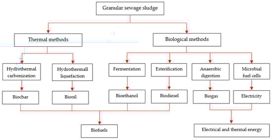 The characteristics of GS suggest that—just like regular surplus sludge—it should be treated not as waste, but rather as a by-product with a wide variety of potential uses, including energy production. This approach opens the door to harnessing the many value-added substances contained in GS and recovering energy from it. It is also fully in line with the principles of circular economy, bioeconomy, and energy and material recycling. The calorific value of GS is estimated to be between 10 kJ/kg DM and 16 kJ/kg DM, similar to that of conventional fuels such as coal and other types of biomass used in the wider energy industry []. In this light, surplus GS can be viewed as a solid fuel or as starting feedstock to produce liquid or second-generation biofuel gas. The recovered energy can be utilized in-house to heat bioreactors or dewater/dry sludge—in fact, there are already many examples of such facilities attaining positive energy balance [,]. Excess heat and power can also be fed into the grid. Applications of GS in energy generation are given in Figure 8.
