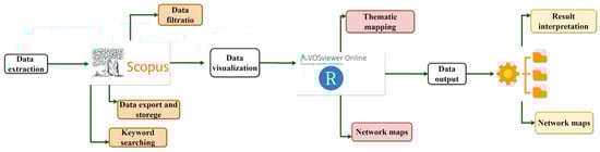 Bibliometric analysis is a quantitative method to analyze data from different areas of study, evaluating aspects such as publications and citations; this type of study began in the 1950s [23]. This research is based on the concept of scientific mapping based on the quantitative approach and bibliometric methods to analyze the structure and development of scientific fields and disciplines [24] and consists of analyzing scientific databases using methods that match the information in scientific databases [25]. This analysis makes it possible to generate network associations to structure the information in scientific maps under the parameters of graph theory to visualize their conceptual subdomains (general areas or particular topics), their thematic evolution, trends, and research agendas. A bibliometric analysis focused on the study of articles, citations, publications, and most relevant authors on the topic of hydrogen production by means of water electrolysis was adopted. The Scopus database was used and keywords such as “hydrogen production”, “hydrogen”, and “renewable energies” were introduced. Thus, we used an exhaustive search in order to seek further theoretical argumentation and to obtain a clearer evaluation in our data extraction. After the extraction of data in Bibtex format which will allow the reading of the data in the software. The progress and contributions made on the topic of hydrogen production by means of electrolysis will be evaluated all using analysis of the research trends and the area of hydrogen production by means of electrolysis and the future growth of the research field (Figure 1).