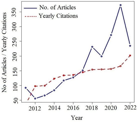The annual number of publications from 2011 to 2022 is presented. The analysis shows that during the first four years of this study (2011–2014) the average number of publications related to the topic of energy generation by means of electrolysis was 74 articles per year, tending to increase. The trend cussing from 2015 to 2021 where the growth is an average of 209 published articles (blue line) as shown in the following Figure 4, in the case of the year 2022 at the end of the research, 235 are shown as of August 12 (date of data extraction). The analysis leads to consider that possibly due to tax incentives and/or financial support generated by different corporate, industrial, and governmental entities, more researchers support this area by publishing their findings. Another reason could be the growing demand for alternative forms of energy that are ecological, environmentally friendly, and sustainable. Thus, both publications and citations among authors increase annually with an average of 133 citations per year in relation to the topic of study.