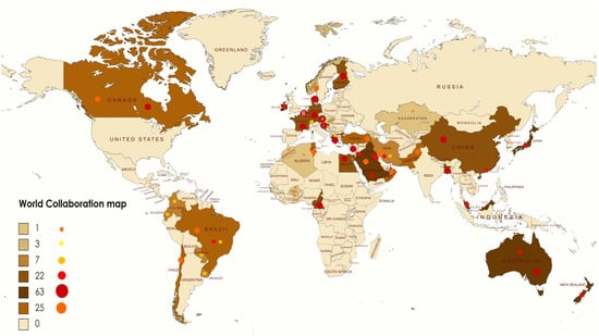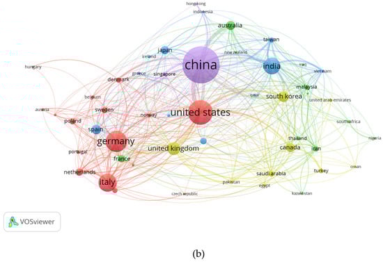 For the creation of the network mapping of the countries and their publications, the citation analysis that can be seen on Figure 6a,b VOSviewer software was used for the construction and visualization of the data, such as the analysis of co-occurrence of keywords, number of citations and countries with more citations. To implement the analysis, the circles on the maps that describe the countries with the most publications are called “nodes”, which are represented on a bibliometric map and the presence of the characteristic being worked on.