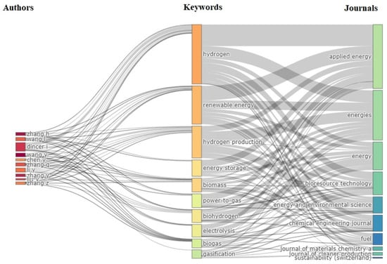 For the co-occurrence of keywords, the following analysis of the words and their classification was performed Table 4 shows a Sankey diagram Figure 7 consisting of three parameters and their relationships between authors, keywords, and journals (Figure 7). Where n is the number of elements in that variable or data set. The links between the components are connected, with gray links indicating the intensity of the network. As for the width of the flow, these indicate the importance of hydrogen production by electrolysis “hydrogen”, “hydrogen production”, and “electrolysis” have been the most used words by the authors in various journals in Table 4 The analysis shows the number of occurrences 291 (30% of articles) used “hydrogen” as a keyword, followed by “renewable energy” 199 (21% of articles), “hydrogen production” 150 (15% of articles) and “electrolysis” 64 (7% of articles).