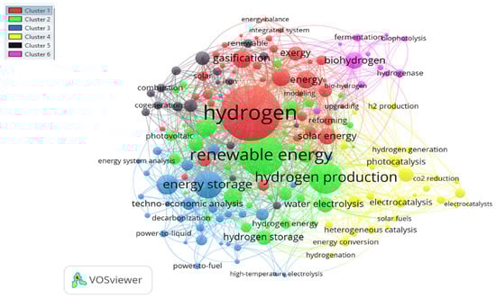 Figure 9 illustrates the cluster of keywords with their critical areas. A total of six clusters were inferred from the thematic research. In this case, we have the first cluster which has (39 items) which is the red color zone and is hydrogen production, the next cluster has (35 items) and is renewable energy followed by hydrogen storage technology with (31 items) and the zone is blue, biohydrogen would be the yellow color zone which has a total of (29items) followed by energy efficiency and electrolysis zones which (17 items) and (11 items).