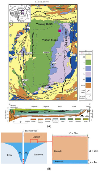 The project of “Coal-to-Oil Chemical Exhaust Capture-Saline Sequestration” was carried out in 2011–2014 in the Ordos Basin by Shenhua Group, the world’s largest coal enterprise, and a total of 300,000 tons of CO2 was injected. This project has a positive demonstration significance. The Ordos Basin is the second-largest sedimentary basin in China, and there are up to nine formations suitable for CCS projects, whose locations are depicted in Figure 1A. The target zone is located in the backfill area of the Shenhua open-pit coal mine in the western riverbed of the Ulan Moron River, which is about 45 km southeast of the Ordos City, China. The longitude is , and the latitude is . The Shihezi Formation is in the interior stable region of the Ordos Basin where it was top to bottom developed in the Cretaceous, Triassic, Permian, Carboniferous, Ordovician, and Cambrian periods. According to CCS experience and stratigraphic characteristics, five reservoir-cap combinations were selected as target storage sites by comparing reservoir factors and economic factors. As one of the main target areas for CO2 geological sequestration, the buried depth of the Shihezi Formation is about 1650–1850 km, belonging to the early Permian period, and the stratigraphic age is 1.5 × 108–5 × 108 years. The reservoir is mainly sandstone with a thickness of 100–200 m, and its average porosity and absolute permeability are 6–13% and 3–7 mD, respectively. The caprock is dominated by mudstone, whose thickness is 150–200 m, average porosity is 6–13%, and absolute permeability is 0.05–0.09 mD [21].