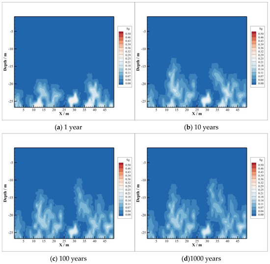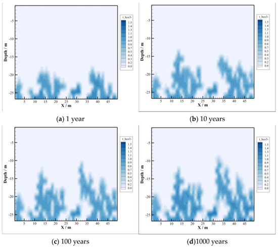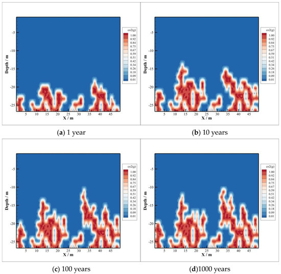 The CO2 accumulated above the reservoir migrates to the caprock at a maximum distance of nearly 10 m within a year, but the overall gaseous CO2 distribution is still concentrated at the interface between the reservoir and the caprock, as shown in Figure 2a. Ten years later after injection, the vertical distance of CO2 migration is over 10 m, as shown in Figure 2b. The maximum vertical migration distance is almost the same in 100 years and 1000 years, close to 20 m. However, the longer the time, the greater the range of lateral migration, as shown in Figure 2c,d. The vertical distance of CO2 invading the caprock remains almost constant after 100 years of injection. There may be two reasons. On the one hand, the reservoir pressure is assumed to be constant after CO2 injection stops, which can provide limited pressure. If CO2 is injected consistently, the increasing pressure will have a great impetus for intrusion. On the other hand, convection and diffusion of CO2 with its dissolution will promote the lateral transport in the process of CO2 intrusion into the caprock. At the same time, some CO2 is mineralized due to the CO2–brine–rock reaction, which may change the porosity and permeability of the caprock to a certain extent. This may also limit the vertical transport of gaseous CO2 in the caprock.