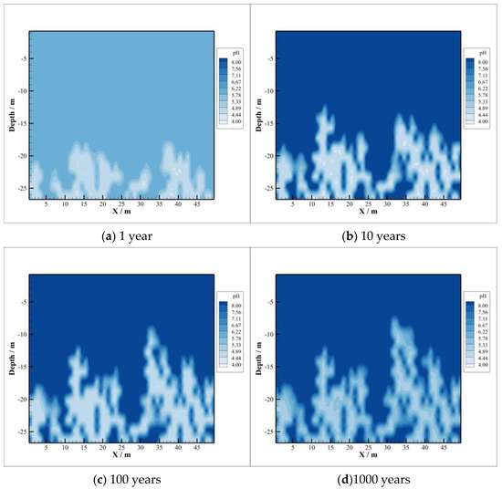 From the comparison of Figure 4c,d, the latter has a higher pH value although the whole area increased slightly due to CO2 diffusion. This is because the dissolved CO2 reacts with minerals in the acidic environment, which buffers the pH of the brine to a certain extent compared with the initial stage of CO2 storage.