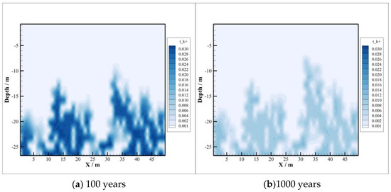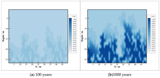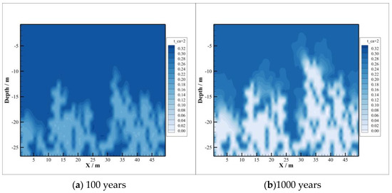 The density of the brine will increase due to the dissolution of CO2, and the region of density change is consistent with the region of dissolved CO2 and pH change, as depicted in Figure 5. The density decreases slightly in 1000 years compared to 100 years. There are two reasons for that. On the one hand, in the early stage of CO2 sequestration, the dissolution reaction is dominant, where minerals will dissolve, and the resulting ions lead to the increase in brine density. On the other hand, the precipitation reaction starts as time goes by, leading to the combination of metal cations and , which results in minerals precipitation. This can also be concluded from the change in mineral content caused by the subsequent CO2–brine–rock reaction.