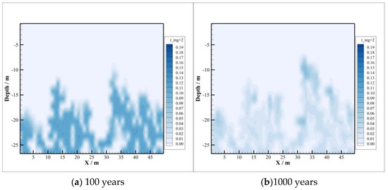 Compared with the concentration distribution of , the change area of and concentration is basically consistent with the area of CO2 intrusion into the caprock, depicted in Figure 7 and Figure 8, and at first the change range of concentration is larger than that of concentration. With the passing of time, the concentration of decreases gradually, while the concentration of increases gradually, which means that combines with the ionized after the dissolution of CO2 to form precipitate, resulting in its concentration becoming smaller and smaller. In the case of , the concentration of increases gradually because albite is dissolved at the initial stage of CO2 injection. By 1000 years after injection, sodium montmorillonite precipitation occurs, where the amount of consumed is too small compared to the amount released by the dissolution of oligaclase. So, concentrations continue to increase after CO2 injection.