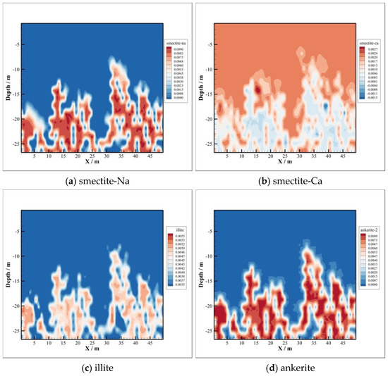 Meanwhile, sodium montmorillonite and calcium montmorillonite at the bottom of the caprock are mainly precipitated, as depicted in Figure 12a,b. The volume fraction of illite and ankerite also increases significantly at the bottom of the caprock, depicted in Figure 12c,d, and the maximum amounts of precipitation are 0.0055 and 0.008, respectively. The precipitation regions of the four minerals mentioned above are basically the same as those of the dissolved minerals, which indicates that the dissolution of calcite, oligoclase, and chlorite promotes the precipitation of these four minerals. Minerals, smectite-Na and smectite-Ca, can also regarded as chlorite reacting with , , and directly, whose chemical equation are listed as follows: