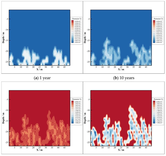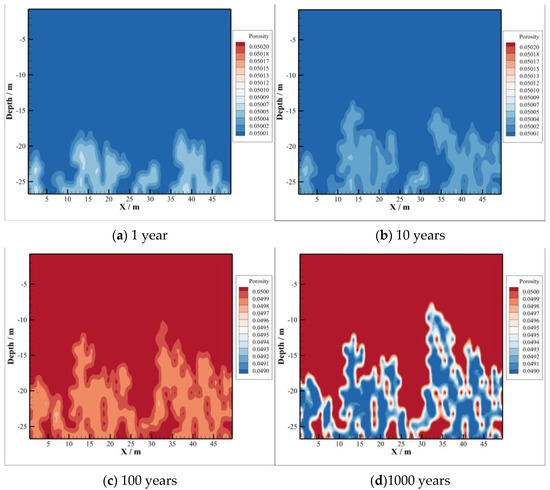 The acidized brine will promote CO2–brine–rock interactions in caprock, where CO2 invade from the reservoir. During CO2 sequestration, both porosity and permeability increase firstly and decrease after that in the bottom of caprock. The reason of their increase firstly is that CO2 dissolves into the brine leading pH values to decrease significantly, where the type of reaction is dissolution. The increase area of both porosity and permeability in caprock is consistent with the CO2 invasion part, which is illustrated in Figure 13a,b and Figure 14a,b, respectively. As time goes on, the precipitation reaction dominates in the caprock. Both porosity and permeability have been decreasing since 100 years after injection, which can be found in (c) and (d) of Figure 13 and Figure 14, respectively. Moreover, the area of decreasing porosity, as well as permeability, is consistent with the area of minerals precipitation.