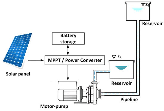 Using an electric motor-pump set with a photovoltaic option, solar energy is converted from solar to electric and used to pump water. Thus, the solar energy is finally converted into the hydraulic energy of the pumped liquid for agricultural or industrial needs. The PV array, power converter unit, battery storage, and motor-pump set are the main components that are included in a photovoltaic pumping system. Induction or alternative current (AC) motors with a centrifugal pump and direct current (DC) motors with a positive displacement pump are the two most widely used motor-pump sets in photovoltaic pump applications. For these motor-pump sets, a power converter unit must have a DC/AC inverter or a DC/DC converter, as well as a maximum power point tracking and battery storage unit. The basic solar water pumping system’s structure is shown in Figure 1.