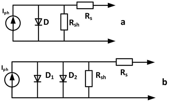 A solar pump’s photovoltaic module is made up of a number of photovoltaic cells that are combined in series and parallel. With regards to model PV cells, there are basically two main types of model. One diode is used in the first model. In addition, two diodes are used in the second one, as shown in Figure 2. In [13] the authors proposed a simplified equivalent circuit, depicted in Figure 2b, that only contains a few diodes, one current generator, and two resistors to account for the dissipative effects. The authors presented a condensed equivalent circuit, with just two diodes, one current generator, and two resistors that account for the energy-loss effects as well as the presence of any constructive flaws.