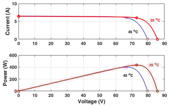 As demonstrated in the above-shown equivalent circuit of a PV cell, the single-diode model can be used as a current source [14]. This model is described in detail by authors in [15,16,17]. It has nonlinear electrical properties that could alter depending on the module’s temperature and solar radiation. In [15] the authors address the research of a photovoltaic cell’s electrical behavior by calculating several parameters, resolving an equations system, and modifying and simulating the conventional model. The authors claim that, in comparison to experimental results, their model enables them to obtain a series of I–V curves that account for environmental variability with errors of less than 1%.