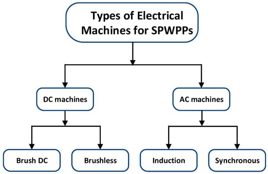 In [36] authors have demonstrated the developed and tested the brushless direct current (BLDC) motor-driven water pumping system based on a single-stage solar photovoltaic generation. Thanks to the suggested system’s design, water pumping powered by photovoltaic-fed brushless DC motors can be accomplished without the use of a DC–DC converter. In [37] authors examined the DC motors attached to the pump and showed how the characteristics of the DC motors and the pump alter under various environmental conditions. In [38] authors examined the dynamic performance of a typical photovoltaic-powered water pumping system. A photovoltaic array, a DC shunt motor, and a centrifugal pump make up the system. The system’s mathematical models in both steady-state and dynamic conditions are considered. In [39,40,41] authors mainly focus on the implementation and investigation of solar photovoltaic pumping systems based on three-phase squirrel cage induction motors. Another analysis regarding the application of DC and AC electrical machines in SWPP is conducted [42].