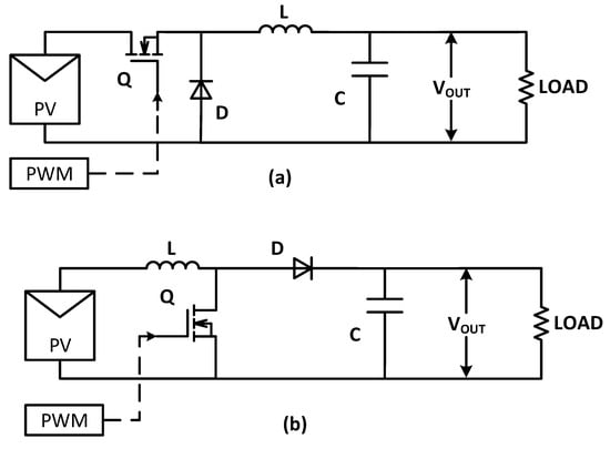 Both of the topologies consist of similar elements including L inductance, C capacitance, D diode, and switching transistor Q. The duty cycle d values calculated by the maximum power point tracking (MPPT) controller are used to generate the pulse-width modulation (PWM) signal that is connected to the gate of the transistor, which in most cases is a metal-oxide-semiconductor field-effect transistor (MOSFET).