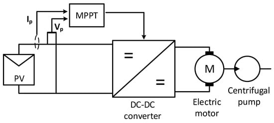 The MPPT technology allows for the harnessing of more electricity from the photovoltaic array, thus increasing the pumping capabilities of the SWPP. Analog and digital MPPT controllers are the two main categories that can be distinguished based on the hardware version. The output voltage of the converter is compared with the control signal’s reference voltage in analog controllers, and the mismatch signal is then processed by a conventional control system based on a proportional-integral (PI) controller. The application of the MPPT controller in a general form for solar photovoltaic pumping systems is shown in Figure 6.
