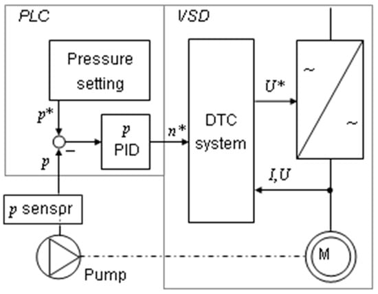 - Gevorkov, L.; Vodovozov, V. Mixed pressure control system for a centrifugal pump. In Proceedings of the 2017 11th IEEE International Conference on Compatibility, Power Electronics and Power Engineering (CPE-POWERENG), Cadiz, Spain, 4–6 April 2017; pp. 364–369. [Google Scholar]