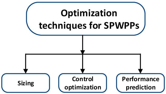 It is crucial to improve the solar photovoltaic pumping system’s performance and reduce losses in order to identify the system’s ideal characteristics. To optimize a system, one should design and manufacture it to be as productive as possible. Below, some optimization strategies are presented by several researchers. Among the optimization techniques the main ones are sizing, control optimization, and performance prediction, Figure 9.