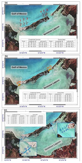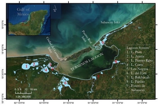 The study area encompasses the region of the TL, located at 18°01′54″–19°13′33″ North and 92°32′33″–90°59′15″ West, in the coastal zone of the state of Campeche, Mexico (Figure 1). TL has borders with the Yucatan Peninsula at the east, the coastal floodplain of Tabasco at the west, and the GoM at the north. It is part of a lagoon system formed by nine satellite lagoons: Pom, Atasta; El Corte, Puerto Rico; Los Negros at the southwest, connected to the TL through the Atasta mouth; Sabancuy estuary to the northeast; Panlao lagoon in the southeast; and Balchacah and the East lagoons at the south. TL is Mexico’s largest coastal lagoon, stretching 75 km along the coast and reaching a maximum width of 26.3 km. It forms part of the country’s largest coastal ecosystem [21,22]. TL is separated from the GoM by two limestone-sand Holocene barrier islands [23,24]. Firstly, Isla del Carmen has 38 km in length and 2.5 km of width. Secondly, Isla Aguada has 40 km in length and 900 m in width. TL connects to the GoM through two natural inlets: the Puerto Real (PtR) northeast and the Ciudad del Carmen (CdC) northwest. PtR inlet has a width of 3.2 km and an average depth of 5 m, located between Isla Aguada and Puerto Real. CdC inlet is located between Ciudad del Carmen and Punta Zacatal with a minimum width of 3.9 km and an average depth of 6.4 m, the largest inlet in the lagoon system. Different authors report varying total area estimates for TL with some starting at 2500 km2 [21,25], while recent studies by [26] suggest a surface area of 1930 km2, including satellite lagoons (Figure 1).