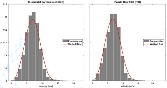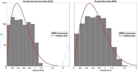 The tidal currents frequency distribution and the Weibull distribution analysis were performed at 4 m depth at the PtR and CdC inlets, as shown in Figure 9. For PtR, the maximum frequencies are observed between 0.4 ms−1 and 1 ms−1, representing 58.4%, while for CdC the maximum frequencies are observed between 0.2 ms−1 and 0.6 ms−1, representing 54.3%. The Weibull distribution fit shows a symmetrical curve with a maximum frequency at 0.5 ms−1 for PtR and 0.4 ms−1 for CdC.