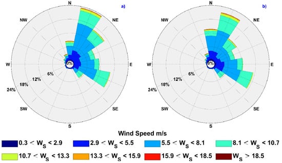 Rose diagrams of wind speed magnitude (ms−1), direction (°), and frequency (%) at (a) CdC and (b) PtR.
