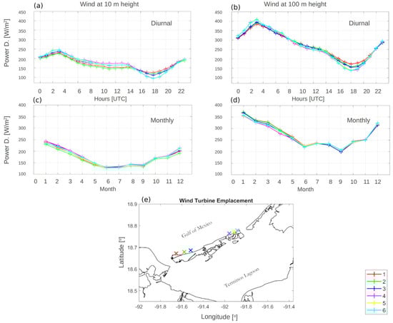 The power density variability at each emplacement points at 10 and 100 m height is shown. (a,b) show the hourly average, while (c,d) show the monthly average. (e) Indicates the location of each emplacement point (color crosses).