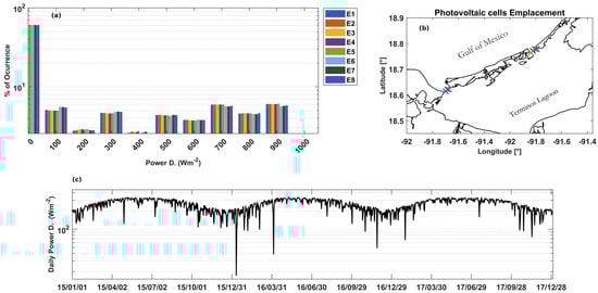 The WRF atmospheric model is a highly versatile model designed for weather forecasting and research, and has a wide range of applications, including idealized and real case simulations, air quality modeling, and ocean-atmosphere interaction studies through coupling with ocean models. WRF was developed by the National Center for Atmospheric Research (NCAR), National Oceanic and Atmospheric Administration (NOAA), National Center for Environmental Prediction (NCEP), Earth System Research Laboratory (ESRL), Air Force Weather Agency (AFWA), Naval Research Laboratory (NRL), Center for Analysis and Prediction Storms (CAPS), and the Federal Aviation Administration (FAA), and is a state of the art mesoscale numerical model aimed to enhance the understanding of atmospheric processes and improve weather prediction. The WRF database used in this work was provided by the Coastal Processes and Engineering Laboratorio from the Institute of Engineering of UNAM at Sisal, Yucatan [34]. The initial and boundary conditions for the numerical simulations were taken from the ERA-Interim atmospheric reanalysis provided by the European Center for Medium-Range Weather Forecast [35]. The numerical scheme configuration used in the simulations was based on the default of the operational forecast of the Institute of Climate Change and Atmospheric Sciences of UNAM [36], along with other standard parametrizations for tropical regions [37,38,39]. For more details on the WRF model, see ref. [40]. The simulation experiment consists of four nested computational domains, with data from the fourth domain used in this study. The fourth domain (D04) is centered on the southern coast of the GoM, approximately from Frontera, Tabasco, to Sabancuy, Campeche (Table 1). The WRF model variables used were u and v wind components (ms−1) at 10 m height and 1000 hPa, 10 m height wind direction (°), air surface temperature (°C), and shortwave radiation (SWDN) (Wm−²). The simulation period covered from 1 January 2015 at 00:00:00 to 31 December 2017 at 23:00:00 h, with hourly temporal resolution. The WRF outputs used to characterize wind and irradiance were validated in a previous study by [41], where the author compared measured data from a weather station in Ciudad del Carmen with the simulated time series of the same variables to ensure accuracy.
